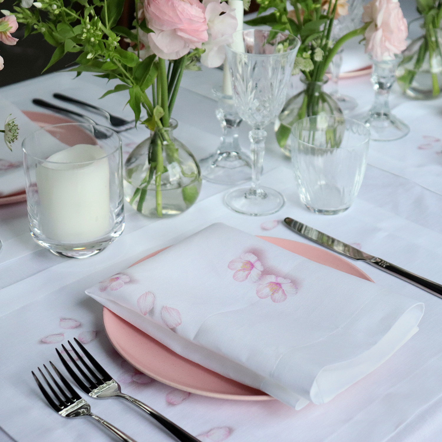Blossom Napkin and Placemat, paired with White Linen Tablecloth