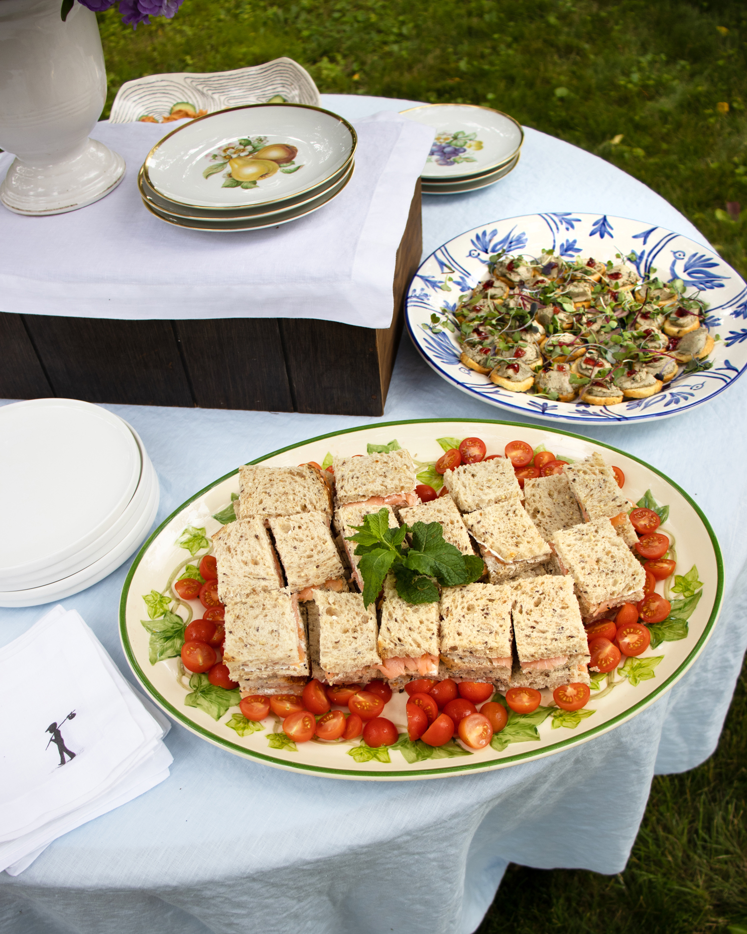 Finger sandwiches are a great option and are a perfect elegant afternoon tea snack. Pick any filling - smoked salmon or cucumber and cream cheese are classics but pick whatever you will enjoy. Accompany with a pile of linen cocktail napkins.